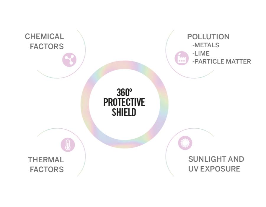 Muodostaa 360 asteen suojakerroksen kemiallisesti käsiteltyjen hiusten ympärille torjumaan ulkoisia rasituksia, kuten ilmansaasteita.